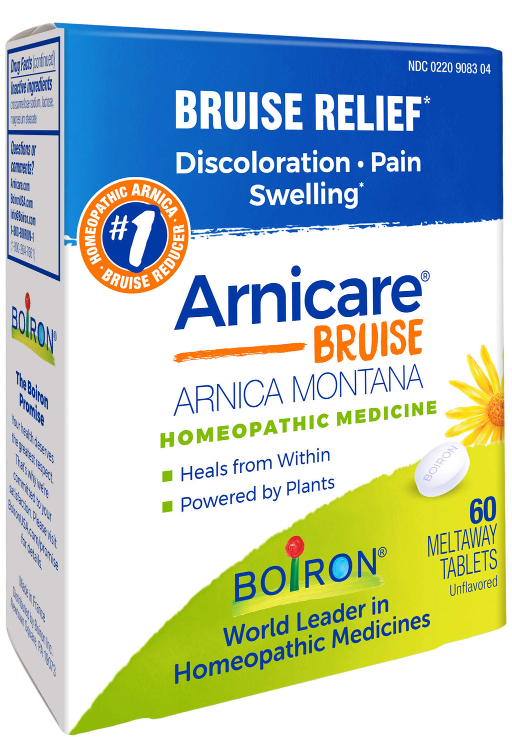 - Boiron Homeopathics Arnicare Bruise Tablets reduce the discoloration of tender and unsightly bruises while relieving related pain and swelling.