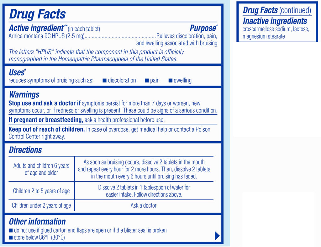 Adults and Children 6 years of age and older: As soon as bruising occurs, dissolve 2 tablets in the mouth and repeat every hour for 2 more hours. Then, dissolve 2 tablets in the mouth every 6 hours until bruising has faded.