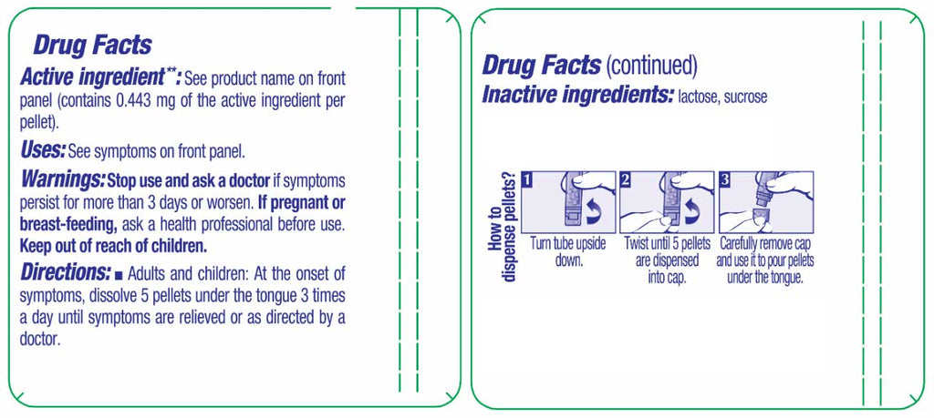 Adults and Children: At the onset of symptoms, dissolve 5 pellets under the tongue 3 times a day until symptoms are relieved or as directed by a doctor.