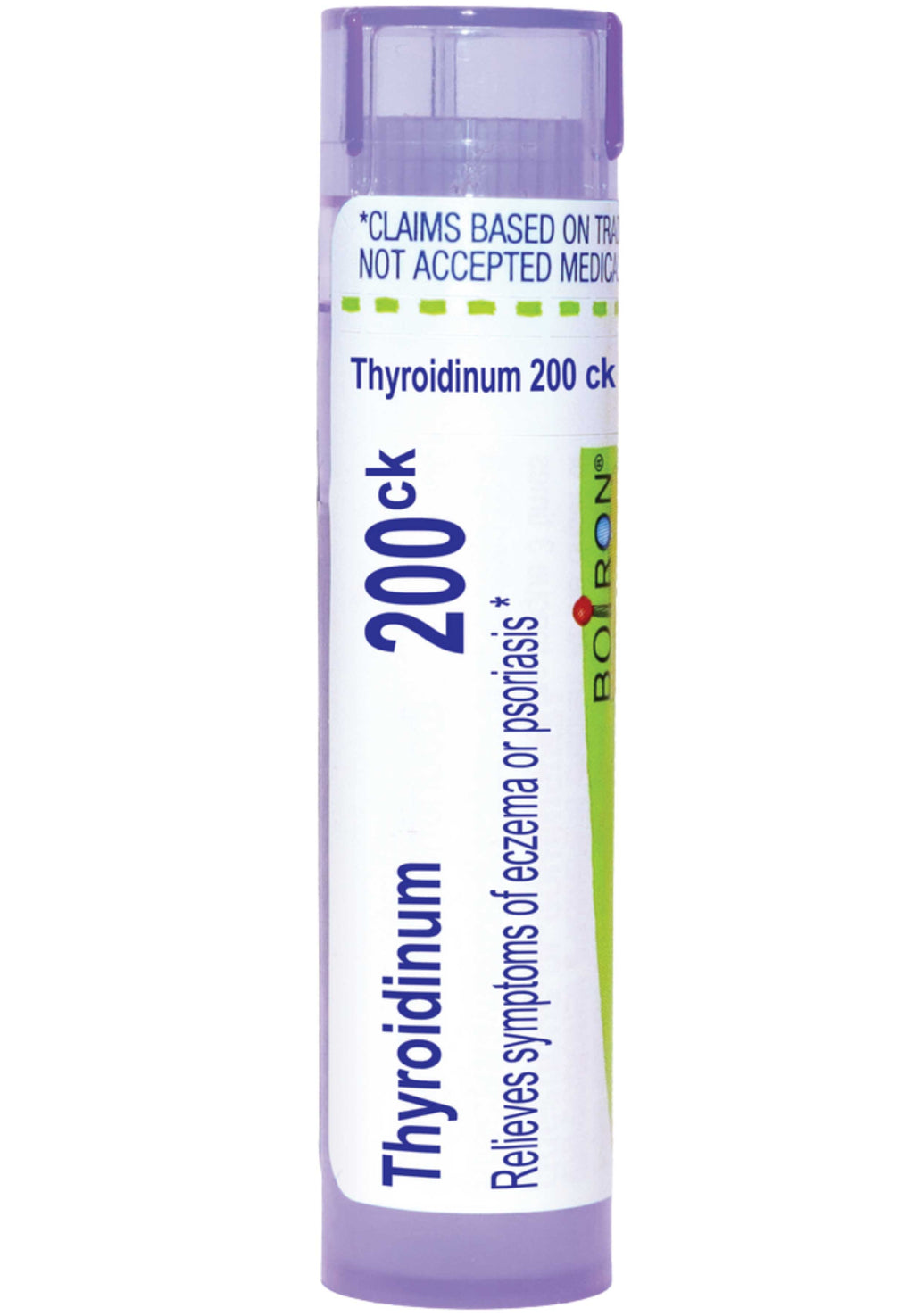 - Boiron Homeopathics Thyroidinum relieves symptoms of eczema or psoriasis.* The pellets melt in your mouth and can be taken on the go, no food or water needed.
