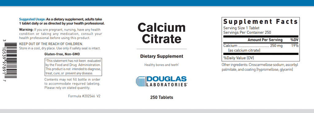 - Douglas Laboratories Calcium Citrate supplies 250 mg of elemental calcium from calcium citrate. Calcium is a primary mineral for building the strong structure of bones and teeth.‡