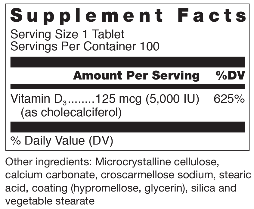 Vitamin D3 (as cholecalciferol) … 125 mcg (5,000 IU) … 625%
