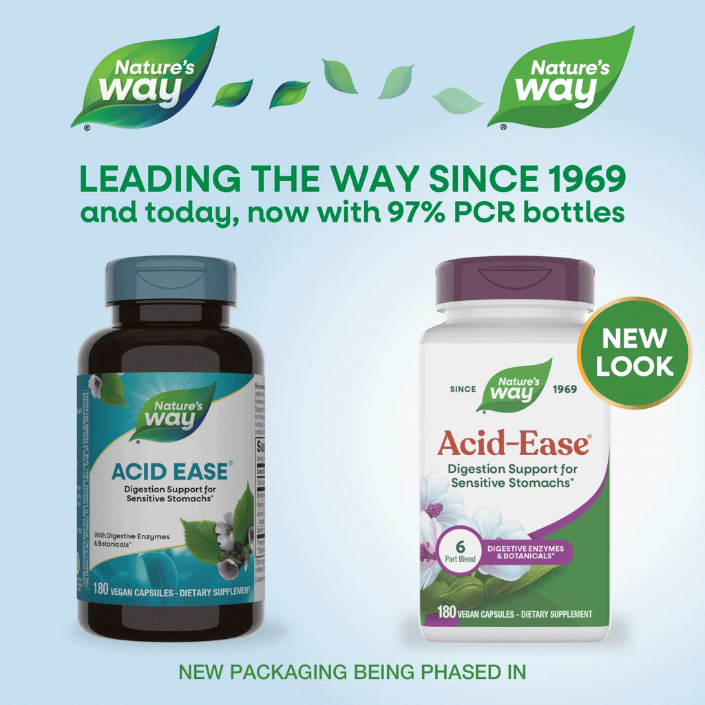 - Nature's Way Acid Ease (Formerly Enzymatic Therapy Acid Ease) is specifically designed for individuals with sensitive stomachs.* Taken with or between meals as needed, Acid-Ease combines Active Enzymes‡ with gamma oryzanol (found in rice bran), slippery elm bark, and marshmallow root extract for digestive support.*