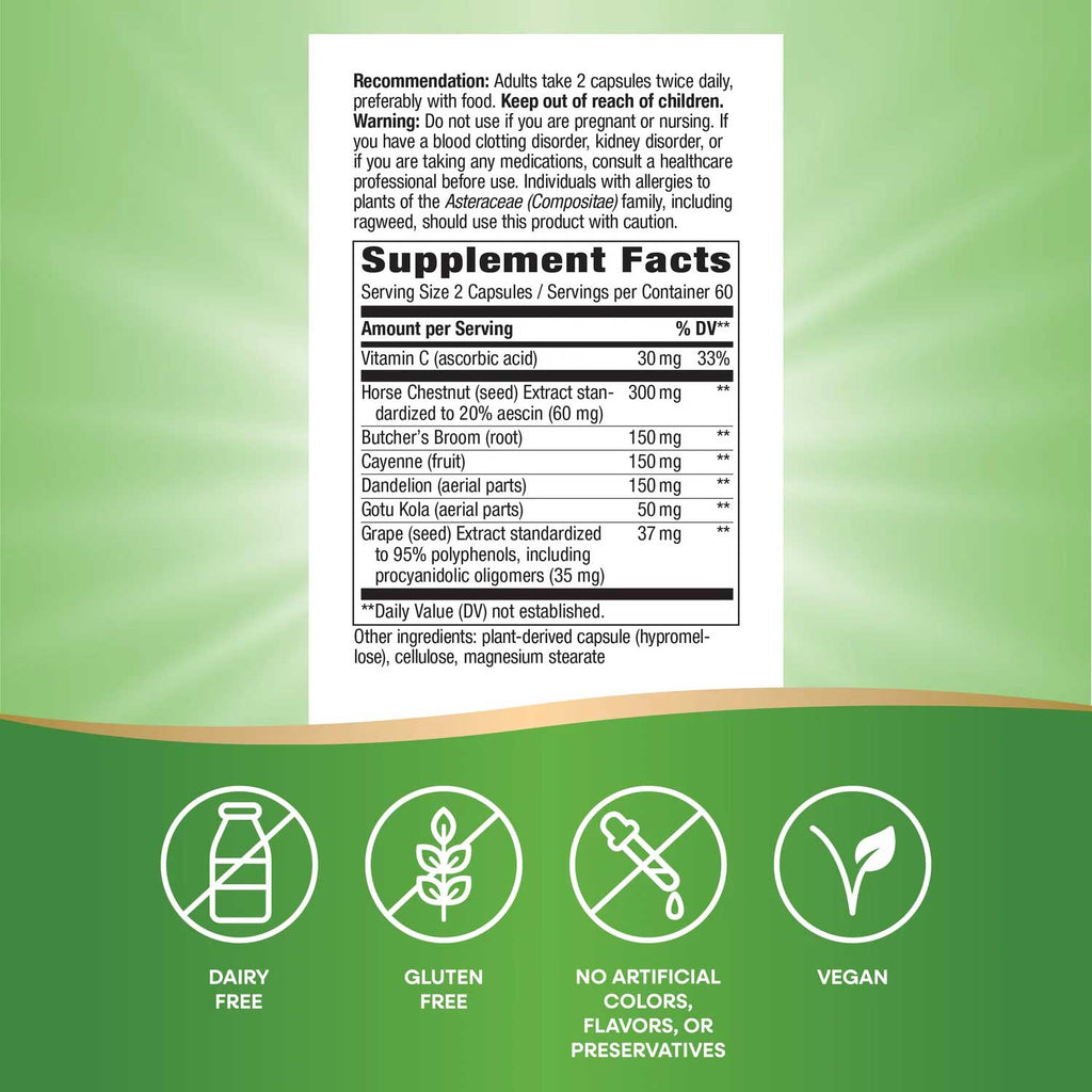 - The premium herbal blend includes horse chestnut seed extract, butcher’s broom, cayenne pepper, dandelion, gotu kola, and grape seed extract, herbal ingredients that have been used for centuries.