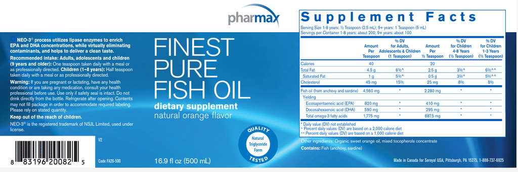 - Pharmax Finest Pure Fish Oil contains a unique mixture of omega-3 fatty acids sourced from anchovy and sardine oils. EPA and DHA help to maintain cardiovascular health, including healthy serum triglyceride levels, and promote cognitive health and brain function.