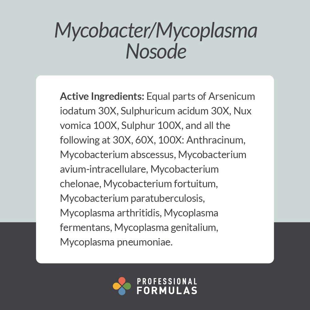 - Professional Formulas Mycobacter/Mycoplasma Nosode is for the temporary relief of cough, minor sore throat, occasional headache, runny nose, tiredness, lack of appetite, or feelings of discomfort or uneasiness.*