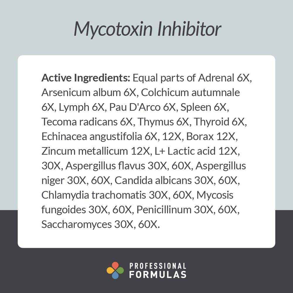 - Professional Formulas Mycotoxin Inhibitor is for the temporary relief of cough, runny nose, itchy or watery eyes, difficulty breathing, minor joint pain, occasional headache, bloating, lack of focus, or fatigue.*