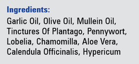 Garlic Oil, Olive Oil, Mullin Oil, Tinctures of Plantago, Pennywort, Lobelia, Chamomilla, Aloe Vera, Calendula Officinalis, Hypericum